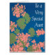 A pretty and versatile greeting card for a Special Aunt, with salmon pink geraniums on a deep blue background, with white lettering, You can send this card to your Aunt for Mother's Day or for her birthday, or even as a 'Get Well' card. From a screen-printed design by Judy Adamson, you can personalise the inside message as appropriate.