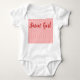 This baby bodysuit has an Art Deco design of salmon curved lines in a triangle shape on a field of white repeated across the design.