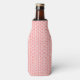 This bottle cooler has an Art Deco design of salmon curved lines in a triangle shape on a field of white repeated across the design.