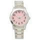 This women's watch has an Art Deco design of salmon curved lines in a triangle shape on a field of white repeated across the design.