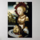 Salome "the Daughter of Herodias ,gorgeous dress and jewellery with white feathered red hat and lake landscape in background by German painter Lucas Cranach the Elder 1530 .