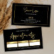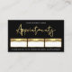 Glam beauty salon appointment card with modern script font, gold effects and black background. You can customize most of the text, add your company details and logo to make this design your own. This luxurious black and gold business appointment reminder card includes 3 faux gold time & date slots or you can add more as you need to. Create luxury lash, brow or nails appointments cards with this elegant design.