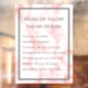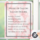 This elegant faux pink marble window cling has grey text that you can edit to replace the display text with the correct information. At the top, there's a line of large grey display text you can replace with your salon's name. The next line says "Salon Hours" (you may change if desired). Under the two lines of large grey text, there are seven lines of smaller grey text for each day of the week. You can change the hours for each day, if necessary.