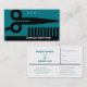The front of this design features a modern and eye-catching scissor and comb deign in an appealing teal, black, and white motif. This automatically signals your profession, and your name is paired nicely with it.