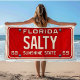 Travel back in time to the year 1969 with this vintage-inspired SALTY license plate design. Bold embossed-style cream text pops on the red contrast. The use of retro-style lettering, realistic screws and Sunshine State slogan keep the vintage vibe realistic. This unique towel is perfect for your next beach day, surf session, boat trip or pool party.