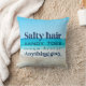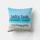 Beach saying throw pillow for anyone who loves the coastal life and spending time on the ocean. Beach photo background and typography design that reads - Salty hair, sandy toes, ocean breeze, anything goes. Design is repeated on both sides.