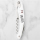 SALUTE! Written in bold black text beside two glasses of red wine toasting! Same design on front and back of the corkscrew wine bottle opener. Clean white background making both sides pop!.