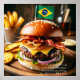 Experience the vibrant flavours of Salvador with this sensational Brazilian Picanha Burger. A juicy picanha beef patty, grilled to perfection, is topped with melted catupiry cheese, sweet caramelised onions, and crispy bacon. All nestled inside a soft brioche bun. A miniature Brazilian flag adds a festive touch, while a side of crispy yuca fries rests on a rustic wooden platter, completing this authentic Brazilian culinary creation.