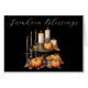 This card features a simple greeting of "Samhain Blessings" with an image of candles and pumpkins. The same image is featured on the inside top of the card, tiled with gold colored pentagrams and triple moon graphics. All of the text, fonts, and background colors may be customized. The images may be adjusted for size and placement.