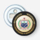The national seal or coat of arms of Samoa, is set on a black background. The emblem is infused into a faux gold circle shape, and that, in turn, is nestled in the middle of a faux gold laurel wreath.