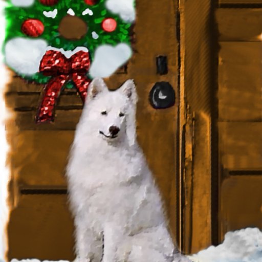 Beautiful Samoyed holiday art. The Samoyed waits on the snow covered porch for Santa to arrive, guarding Santa's cookies. Wonderful Christmas gifts, Christmas cards, postage, apparel, and more.