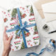 The repeated pattern on this Christmas wrapping paper includes an image of a beautiful white Samoyed dog wearing a festive red bow. The dog sits in front of a decorated Holiday tree. Stylised red and green text says MERRY CHRISTMAS", and your own signature is in two fields for you to customise. Other images included in the pattern include red decorative snowflakes, candy canes, and a peppermint lolly pop. Cute!