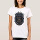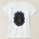 This visually striking image depicts a skull adorned with a traditional samurai helmet. The helmet features intricate details, including horns, spikes, and gold accents. The skull's eyes are hollow and empty, while its mouth is open in a menacing snarl. The overall colour palette is a combination of blue, black, and gold, creating a striking contrast. The image is rendered in a bold, graphic style, with strong lines and vibrant colours.