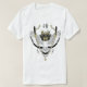 This design features a dove of peace wearing a Samurai battle helmet with golden fig leaves wrapped around two Samurai swords. War and peace are battling each other with the Japanese kanji symbol for Samurai at the top of the design. It looks best on white or darker colored shirts.