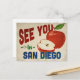 A charming San Diego California vintage travel postcard featuring a lovely red apple, along with fun retro style text that says, "See you in San Diego"