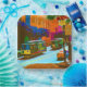 Colourful graphic of a street scene at San Francisco with cable cars...