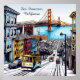Ai art depicting a scenic view of San Francisco, California bridge, water and buildings.