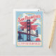 Capture the essence of the Golden City with this beautiful San Francisco postcard, featuring the iconic Golden Gate Bridge in a captivating retro travel poster style! This vibrant vintage illustration perfectly embodies the spirit of San Francisco, California, USA, accompanied by the beloved phrase, 'I LEFT MY HEART IN SAN FRANCISCO.' The artistic depiction includes classic elements like a street lamp and pine tree against a stylised sky, creating a truly nostalgic feel.