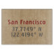 Modern, urban design features latitude and longitude map coordinates of San Francisco, California on brown distressed cardboard coloured background
