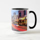 Traffic, captured with blurred motion, rush along Columbus avenue in North Beach in San Francisco at night. The avenue leads to the financial district.