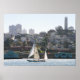 A sailboat passes Coit Tower and the city of San Francisco, California. San Francisco skyline makes a great souvenir of your visit.