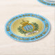 The national coat of arms of microstate, San Marino, is infused into the center of a faux gold circle shape. Around this image, are the official names of the country, in Italian and English.