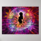 Behind the mother’s silhouette subtly lays the sacred geometry symbol of the “Flower of Life” and image of the full moon, conveying a connection to its associated symbolic aspects as well as the lunar cycle’s influence. A halo marks her moment of illumination as rings of light project outward signifying the sense of inter-connection and gnosis. Fractals that resemble flowers and ribbons of light bloom wildly in all directions.