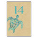 Stylish beach themed wedding reception table number card done in a sand look with graphics of a turquoise blue decorative turtle. Personalise the turquoise blue number for each table at your reception.