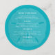 Wedding / event menu template with a tropical beach theme. Big sand dollar design is printed on either round or square cards in aqua blue colour with beach sand image on reverse. All text is white with section titles in casual printed lettering and four places to add appetizers / hors d'oeuvres, salad, entrées, and dessert. Include up to three lines of text within each menu section. This menu also works for any other occasion, such as retirement parties, graduation dinners, or surprise birthday gatherings, as there are no templates for names, etc.