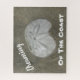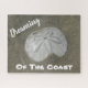 This jigsaw puzzle features a nature photo that captures a sand dollar sitting in wet sand. The white sand dollar is surrounded by brown and grey sand. "Dreaming Of The Coast" appears along with the sand dollar and can easily be customised if you wish.