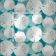 Fabric with sand dollars pattern in white and light blue. Background is dark teal, blue-green colour and is easy to change. Large and small sand dollars overlap to create this beachy design. Choose a favourite material and size.