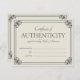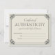 Elegant certificate of authenticity flat card in dark grey and eggshell to which you can add your name or business name inside an ornate vintage-inspired frame. Off-white certificate of authenticity flat card with elegant frames and fonts.