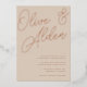 A beautiful typography based wedding invitation featuring your names in oversized rose gold foil script lettering at the top. Personalise with your wedding details in classic serif lettering aligned at the lower right. Our Sand colorway is an elegant mix of earth tone shades, with pale cream and terracotta clay lettering on a soft sandy beige background.