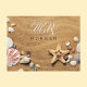 Personalise your monogram in white script text and your name in black on a beach scene of sand and sea shells.