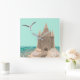 A seagull hovers over a sandcastle by the sea with sea shells on sea-foam green background!!