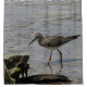 A greater yellowlegs sandpiper walking past some driftwood in a salt marsh