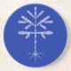 A 4.25" diameter sandstone coaster with a cork pad backing, in Simon's Rock blue with a white chevron sapling.
