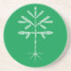 A 4.25" diameter sandstone coaster with a cork pad backing, in Simon's Rock green with a white chevron sapling.