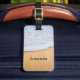 A luggage tag with a photograph of a golden brown sandy beach with white foamy surf.