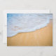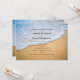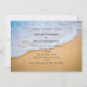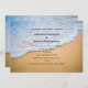 A wedding invitation with a photograph of a golden brown sandy beach with white foamy surf and blue water.