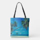 A monogram tote bag with a tropical themed photo featuring coconut palms stretching out across a secluded white sandy beach. Turquoise waters and an azure blue sky in the background.