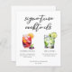 This chic signature cocktails menu sheet features simple black typography above 2 drinks and their ingredients for your wedding bar. A cute summer Sangria and Gin and Tonic drawing add a cool flair to your bar menu. Complete with the couple's names and date for their reception.
