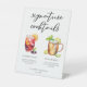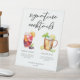This chic signature cocktails pedestal sign features simple black typography above 2 drinks and their ingredients for your wedding bar. A cute summer Sangria and Moscow mule drawing add a cool flair to your bar menu. Complete with the couple's names and date for their reception.