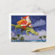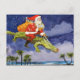Santa Claus is riding on an alligator. Quite a sight. Santa, being quite resourceful, has trained alligators for Florida deliveries. Reindeer don't do well in the Florida climate, so he has taught gators to fly. Santa Claus is an amazing jolly old fellow, and this is how we do Christmas in Florida. This unique postcard will surprise your northern friends with how Santa makes deliveries in Florida. Design from an original watercolor by Mary Hamilton.