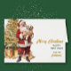 On the front of this cute Holiday greeting card, a joyful Santa Claus holds a Golden Retriever puppy. He stands next to a gold decorated Christmas tree. The gold script text at the right says "MERRY CHRISTMAS", with HAPPY NEW YEAR in green below it. Your custom signature is in green and gold at the bottom. All the text, inside and out, may be easily changed to anything you'd like. You can see more Golden Retriever images, as well as other breed images, at Dog Village.