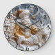 A beautifully crafted clock features Santa Claus dressed in ornate gold and white robes, seated beside a serene reindeer.