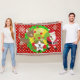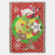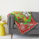 Santa and Reindeer Christmas holiday throw blanket, colourful, fun, cute, and cheery! Features Santa Clause dressed in his red suit and stocking cap with a bag of toys flung on his back, a Christmas tree with red balls, cute brown reindeer, snowflakes, and white polka dots on a background of red, green, and yellow. There's also a star shape banner you can personalise with your monogram initial!