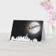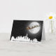 Santa in sleigh with reindeer and glowing full moon flying over white big city skyline.