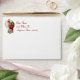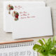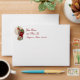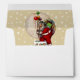 Holiday envelope with an insert of Santa stepping into a very narrow chimney with a huge bag of gifts on a pale gold and snowflake background. The return address is customisable.