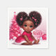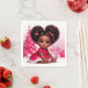 Elevate your Christmas Baby Shower table decorations with our enchanting holiday napkins. These napkins feature an adorable African American infant baby girl with big pretty eyes and pinchable chubby cheeks. She sits barefoot with afro puffs, donning a charming red and pink Santa Baby dress. The delightful design is set in front of a pink sparkling Christmas tree, with 'Santa Baby' in red and pink text to the right, all on a pink and white festive Christmas background. Create a memorable and heartwarming atmosphere for your celebration with these unique napkins